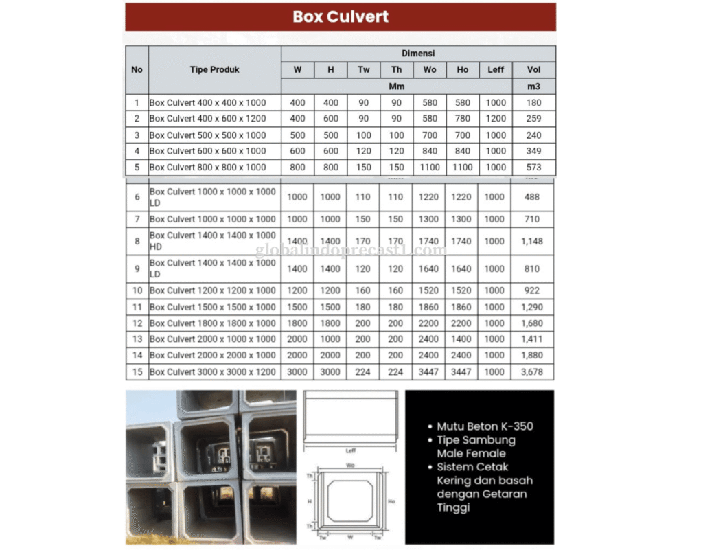 Box culvert merupakan solusi modern untuk sistem drainase dan saluran bawah tanah yang kuat, efisien, dan mudah dipasang. Dengan keunggulan dalam hal daya tahan dan kecepatan konstruksi, box culvert banyak digunakan dalam proyek-proyek infrastruktur, baik skala kecil maupun besar. Perencanaan teknis yang tepat akan memastikan struktur ini berfungsi optimal dan tahan dalam jangka panjang.