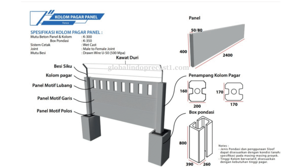 Jumlah panel per bentang: Disesuaikan dengan tinggi pagar (misalnya 6 panel = tinggi ±2,4 m)