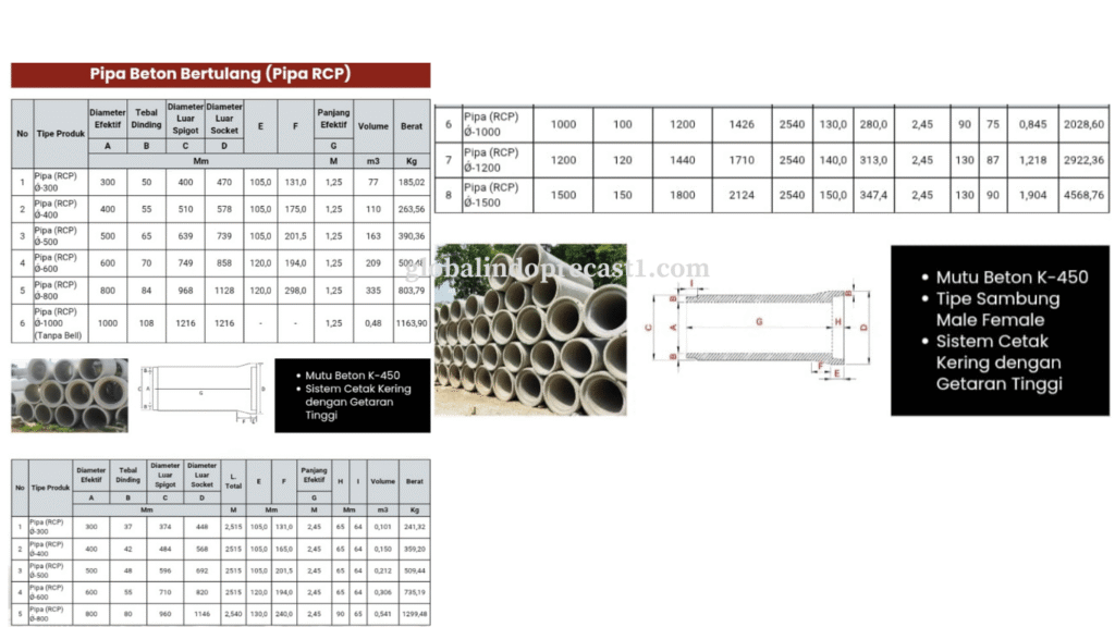 Pipa RCP tersedia dalam berbagai diameter, mulai dari ukuran kecil hingga lebih dari 2 meter, yang bisa disesuaikan dengan kapasitas aliran yang dibutuhkan. -